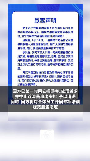 经核查,8月18日,一名由第三方合作公司提供的演职人员在泼水互动时,因个人原因与游客发生争执。对此,我们高度重视并作如下处理: