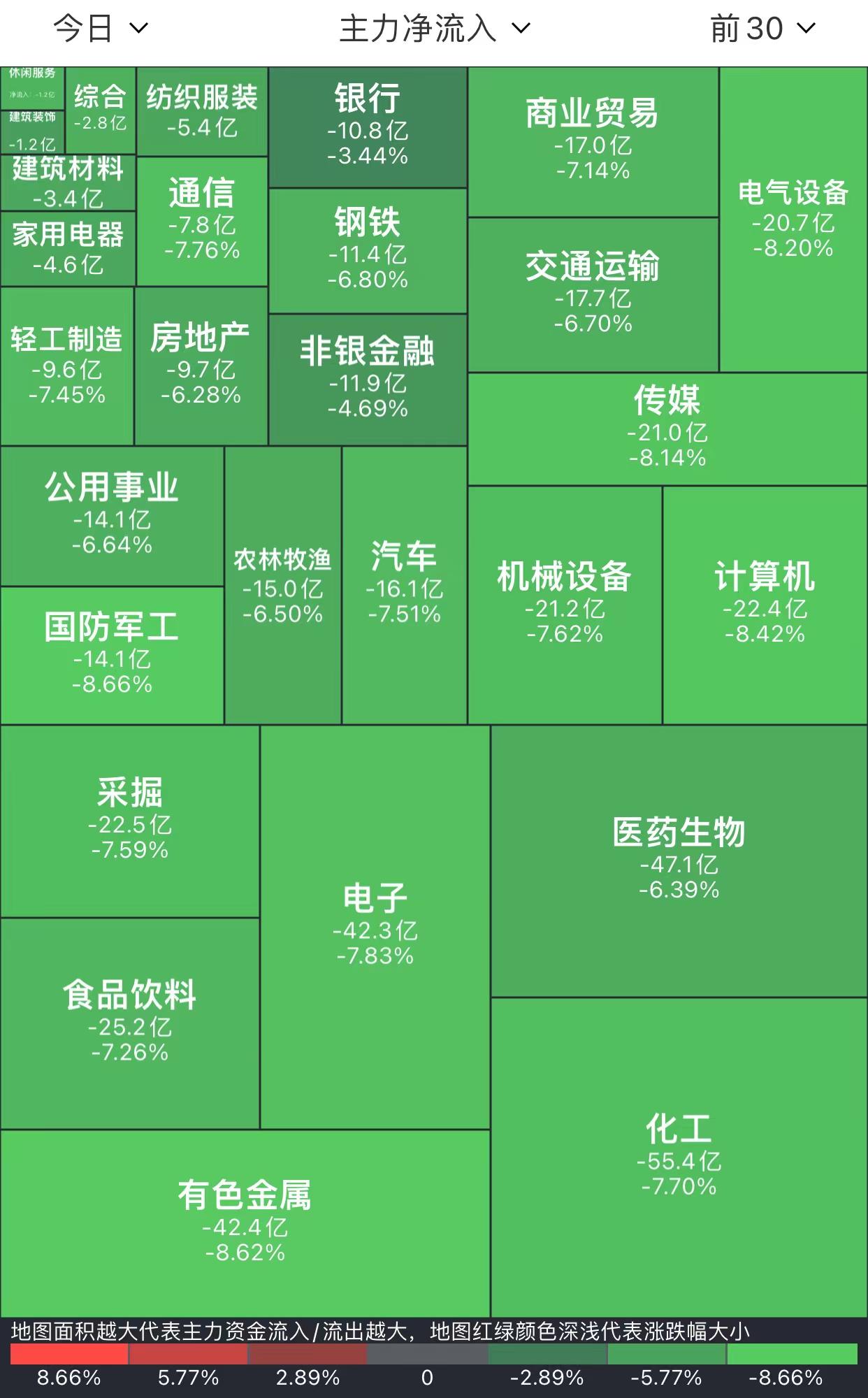 行业板块全线飘绿,工程咨询服务、银行、航空机场、证券、工程建设等跌幅相对较小,船舶制造、小金属、计算机设备、航天航空、能源金属等跌幅靠前;题材方面,肝素、超级品牌、券商、地下管网等概念相对活跃。