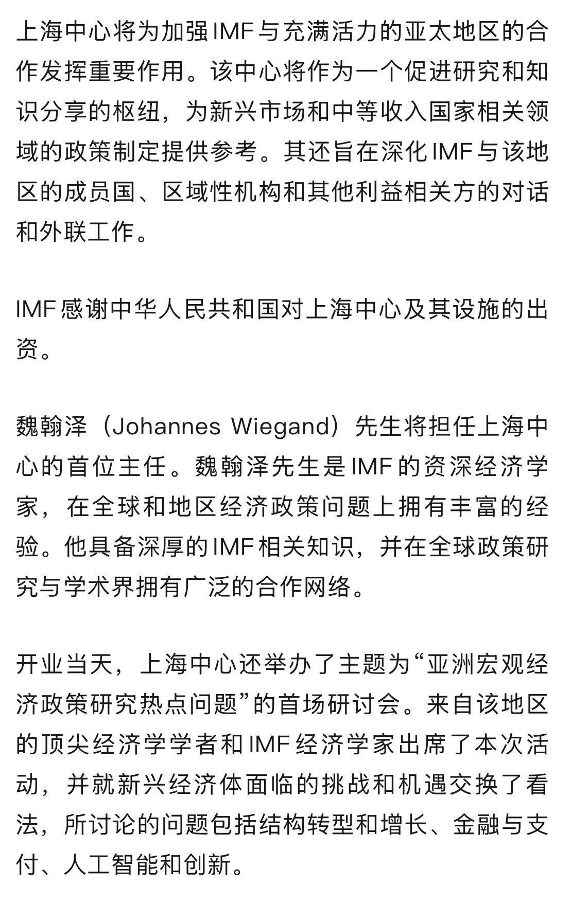 继此前宣布在中华人民共和国成立上海中心后,今日(12月8日),国际货币基金组织(IMF)正式启动了该中心的运营。