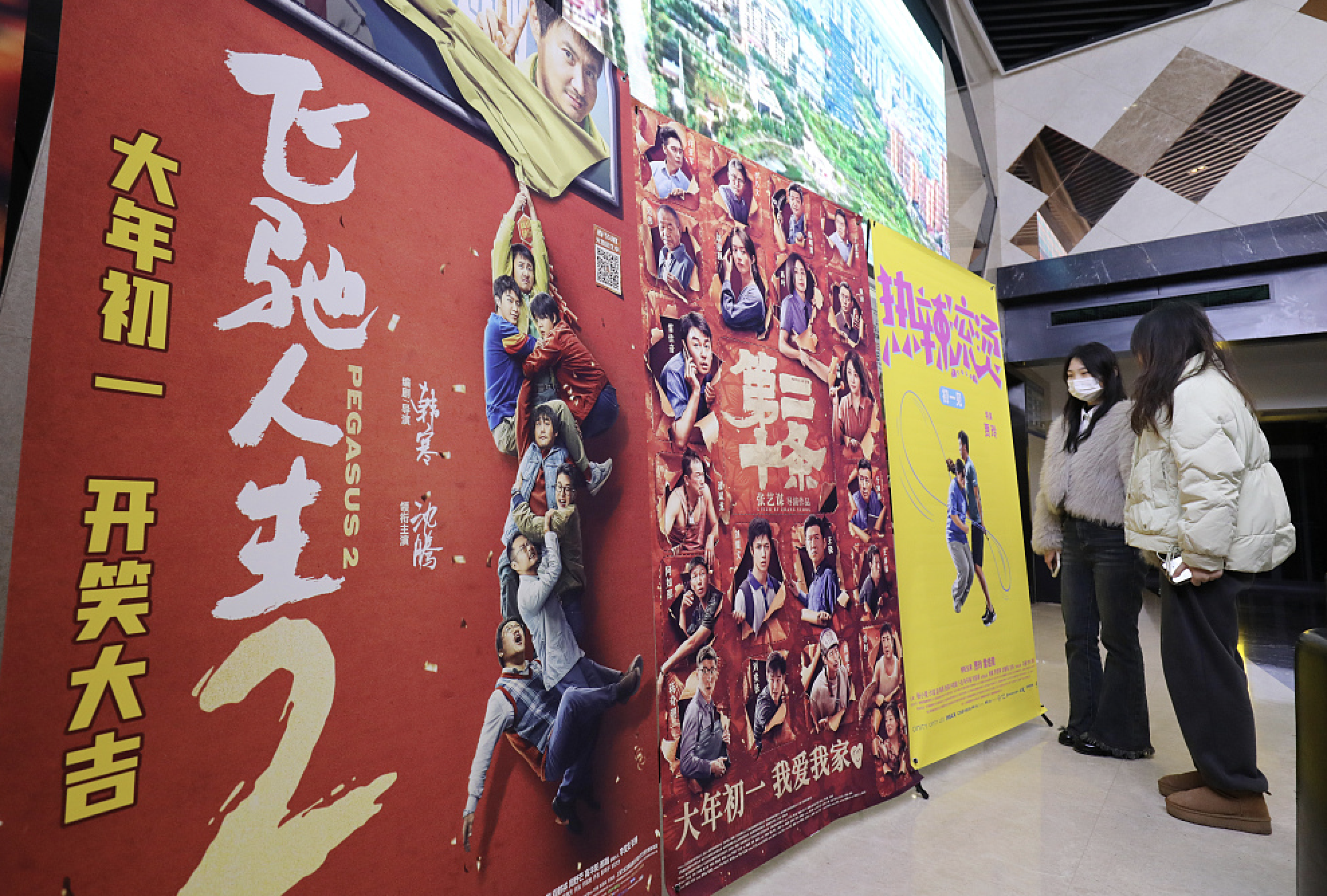 2024年2月3日,重庆市,市民通过2024春节贺岁档电影海报了解春节档贺岁片。图源:视觉中国