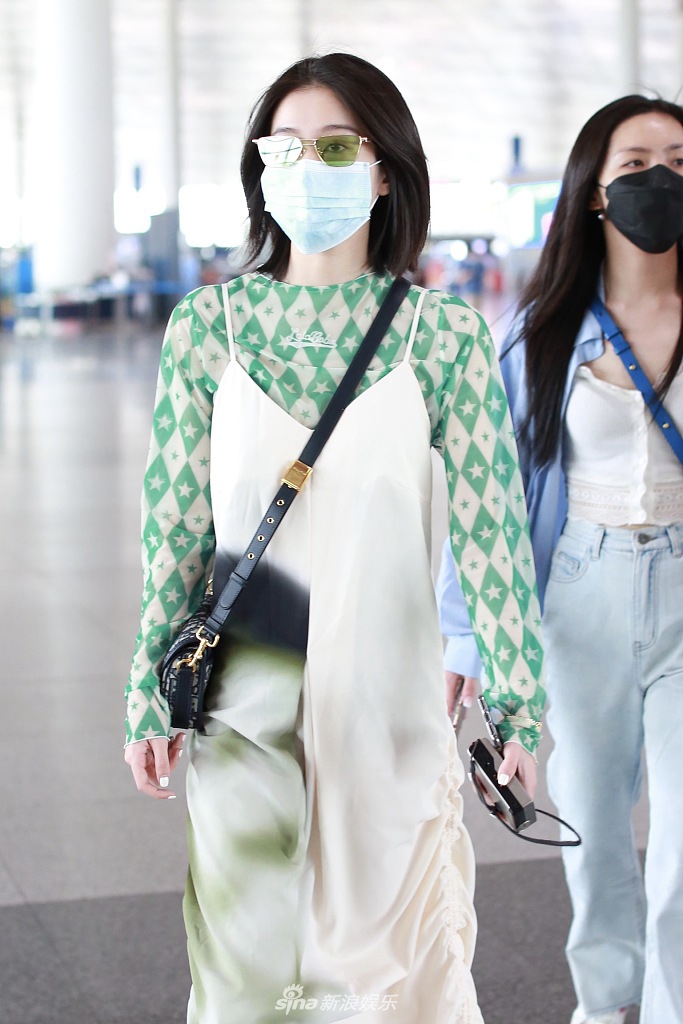 张雪迎穿绿色纱裙现身机场 清爽短发造型少女感满分