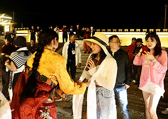 当晚,作为活动第一批客人的网红达人们刚抵达格萨尔王城门口,就感受到了当地干部群众的热情,“格萨尔王王妃”身着盛装,手捧哈达,在王城门口击鼓迎相迎,并逐一敬献青稞酒,带领大家转煨桑炉祈福,在切玛盒前体验洒青稞和糌粑祈福仪式。