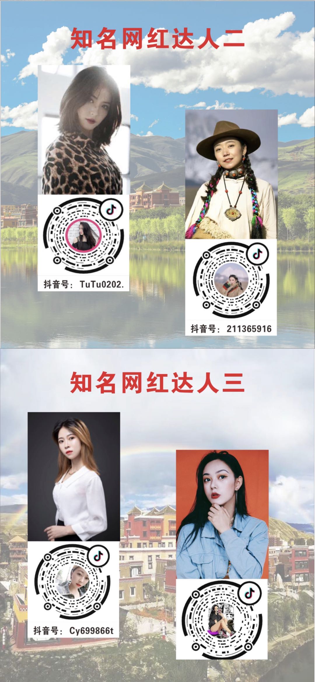 为打好“网红牌”、利用新媒体持续引爆格萨尔王城,7月17日—21日将举办“网红达人格萨尔王城行”活动。请大家积极组织人员参加并点击图片左下侧下载原图,查看关注内容,通过“抖音短视频”APP扫描关注网红达人,点赞、转发王城宣传视频。