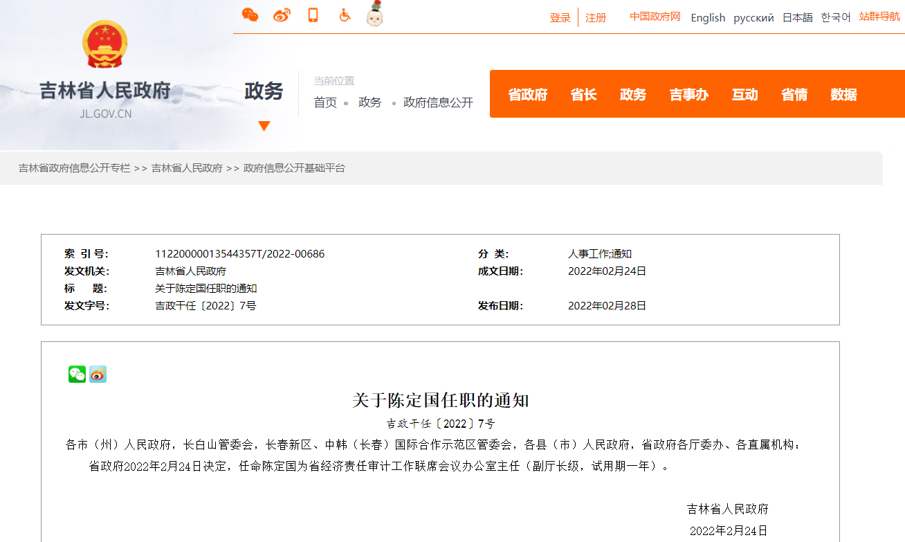 关于陈定国任职的通知吉政干任〔2022〕7号各市(州)人民政府,长白山管委会,长春新区、中韩(长春)国际合作示范区管委会,各县(市)人