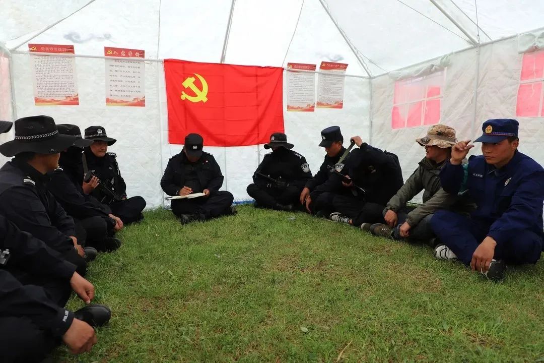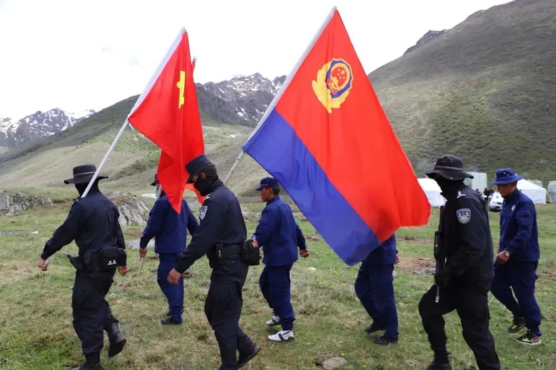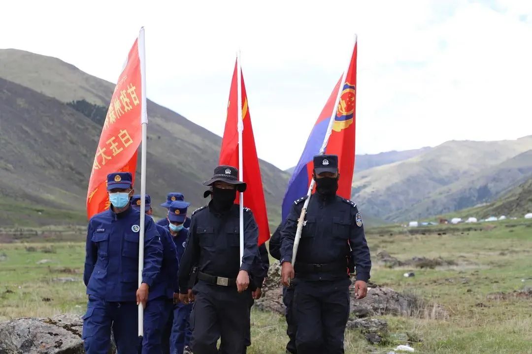 每天清晨,采挖群众准备上山虫草,白功便会组织干警、打火队员们开始列队集结,排成纵队、逶迤前行,鲜红的党旗在广袤的大山深处、崇山峻岭间格外耀眼。他们或是骑马、或是骑摩托、或是步行出动,便会展开一整天的巡逻工作。
