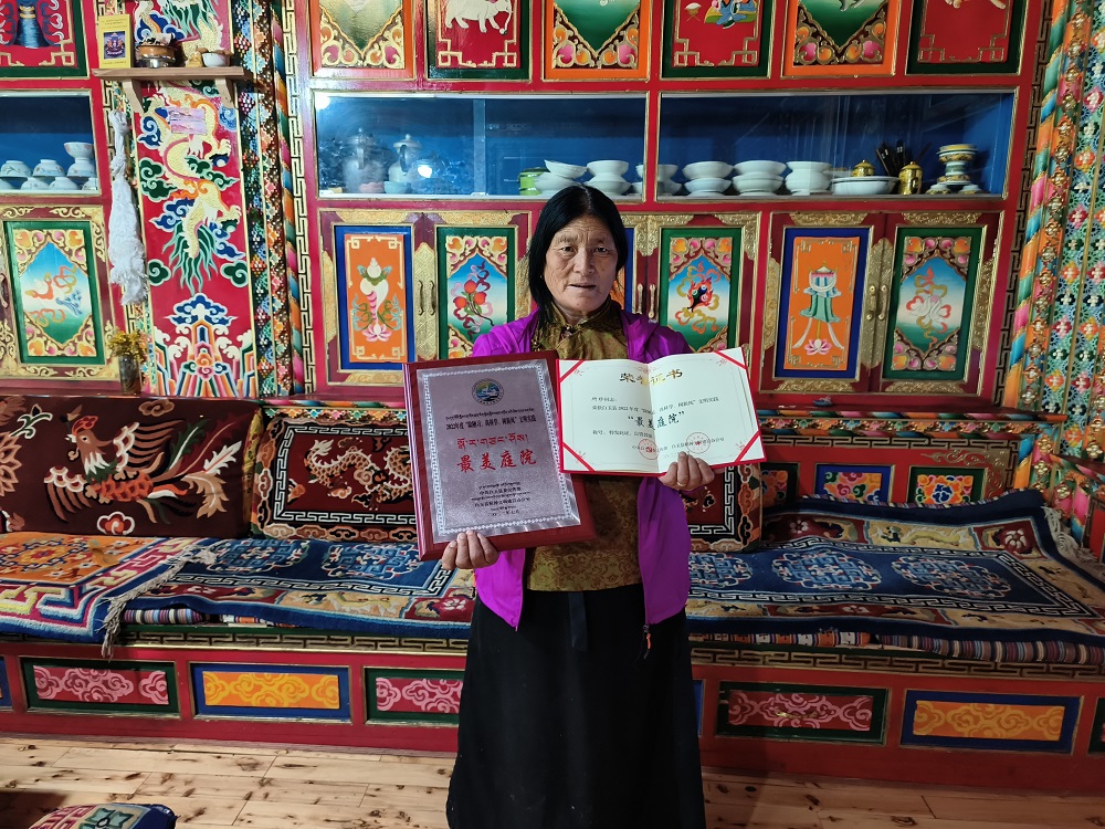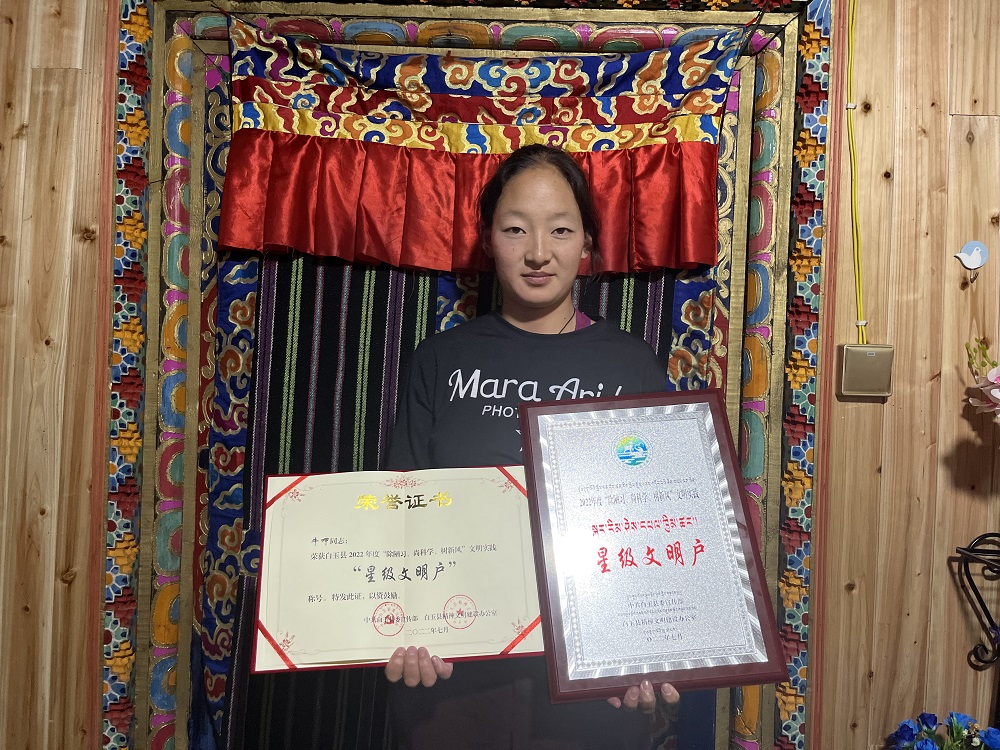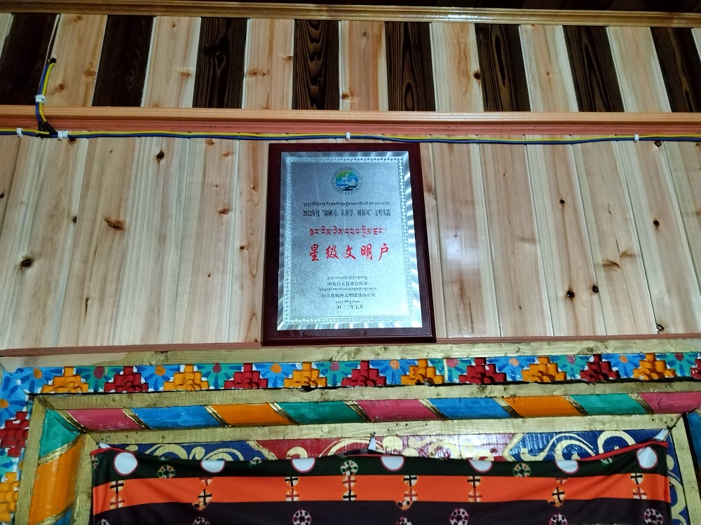 在白玉县麻邛乡根日村村民牛呷家中,整齐有序的厨具、被子,干净、温馨的庭院让人眼前一亮。“我们昌台片区是牧区,以前过着游牧生活,想把家里收拾的干净整洁,条件也不允许,但是现在我们有定居点有自己的家,我爱干净,也喜欢收拾,今天我们村获得了最美村组,我也是“五星级文明户”,我感到非常的高兴和激动,以后也会继续发挥“星级文明户”示范作用,带动家人和周边村民感党恩、爱祖国、守法制、讲文明、爱卫生,获得“五星级文明户”的牛呷激动的告诉记者。