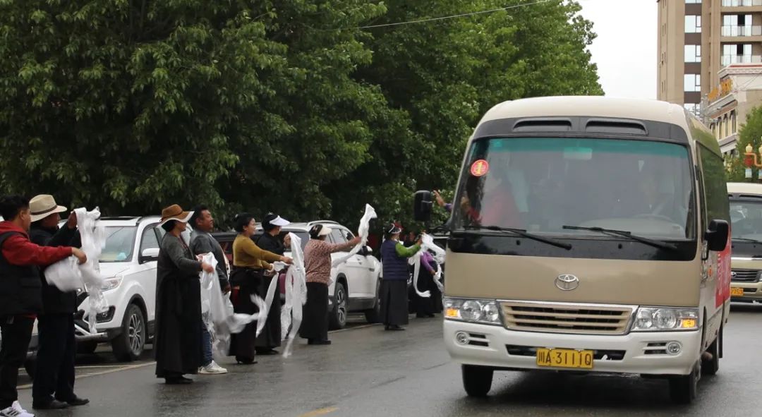 满载十八军后代的汽车驶入洛须镇,村民们手拿哈达,眼含热泪,夹道欢迎十八军代表团。