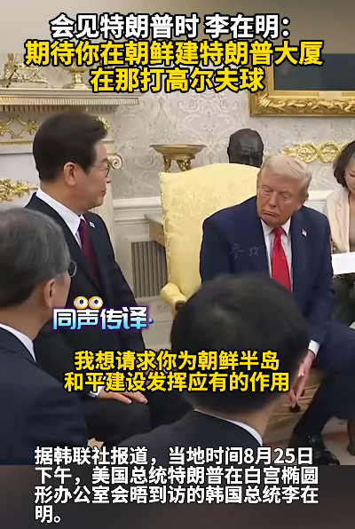 韩国总统李在明表示,“我期待你与金正恩委员长的会晤,在朝鲜建造特朗普大厦以及在那里打高尔夫球”。