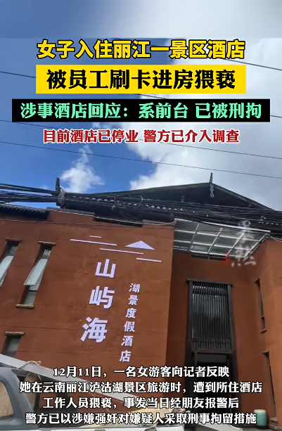女子独自入住丽江泸沽湖景区酒店,遭前台刷卡进房猥亵,“事后酒店只发过一条微信道歉”;警方介入调查,已暂停营业
