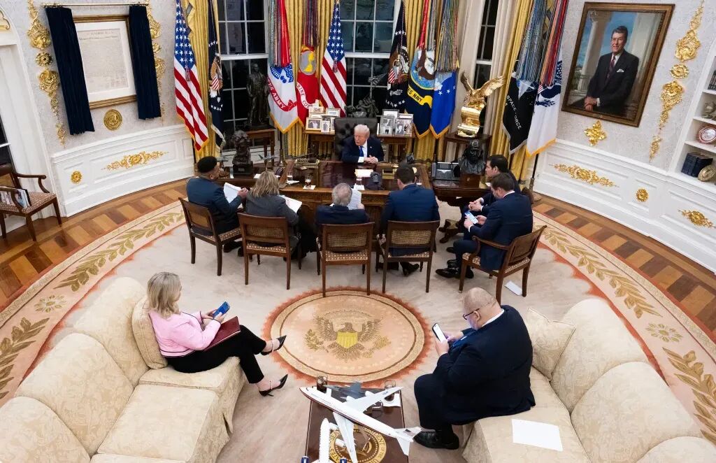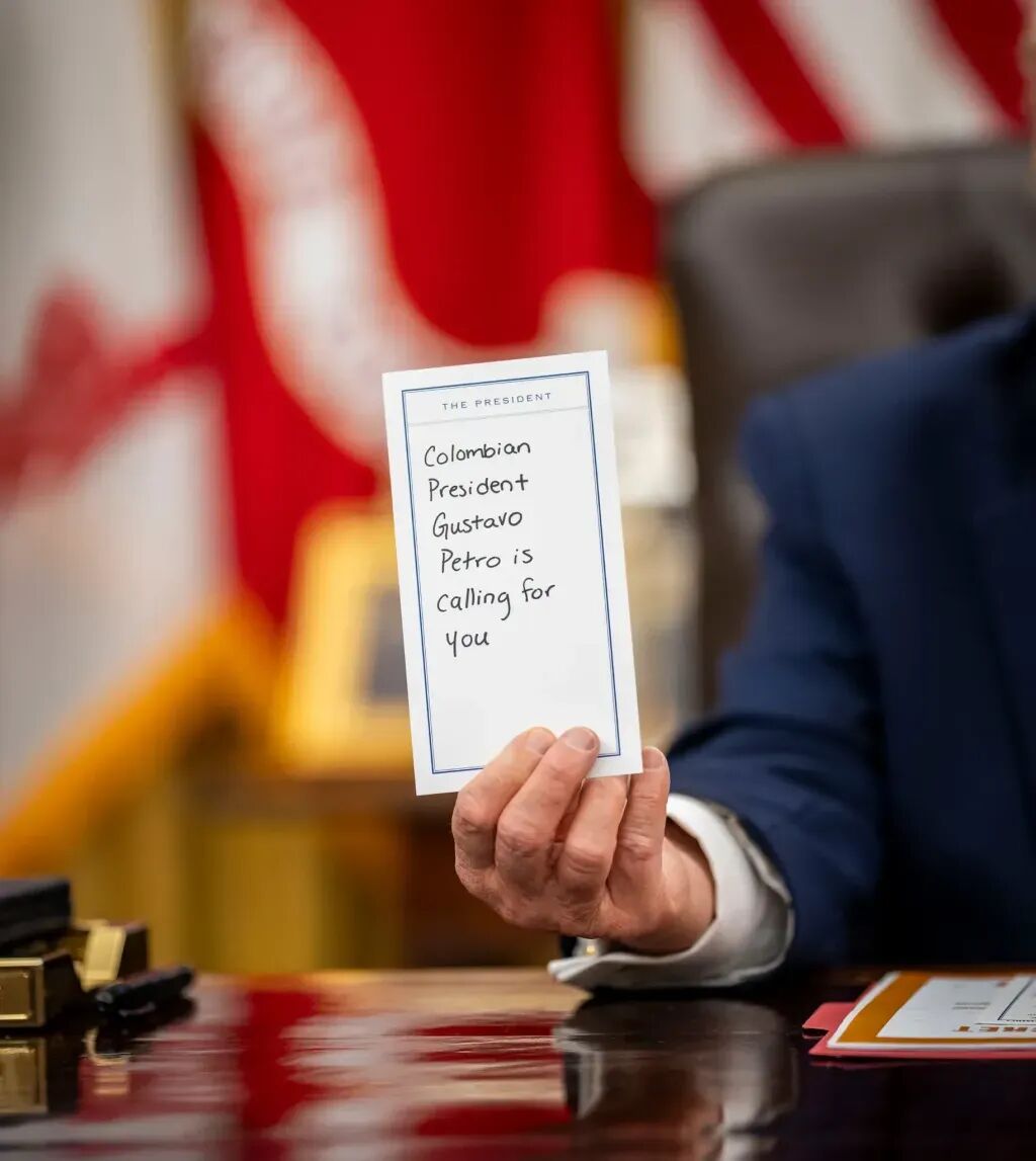 随后,一名助手现身,递上一张写着紧急指示的便条:“哥伦比亚总统古斯塔沃·佩特罗来电。”特朗普把一根手指放在嘴边,示意在场所有人保持安静。记者们这才注意到,副总统万斯已经悄然把椅子挪到了国务卿鲁比奥身旁。通话内容不对外公开。