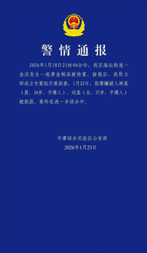 福建平潭综合实验区公安局1月23日通报:2026年1月18日21时40分许,我区海坛街道一金店发生一起黄金制品被抢案。接报后,我局立即成立专案组开展侦查。1月22日,犯罪嫌疑人林某(男,34岁,平潭人),刘某(女,37岁,平潭人)被抓获,案件在进一步侦办中。
