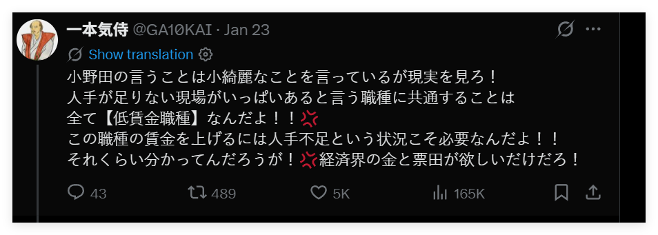 从评论区来看,这些右翼民粹分子大多认为小野田是在危言耸听,为自己的不作为找借口。有人认为,小野田之所以认为日本各个行业都离不开外国劳工,是因为日本政府只在乎企业的利益,而企业势必会在日本人和外国劳工之间选择人工成本更低的后者。还有人认为,小野田是在通过强调外国劳工的重要性,回避日本官方是否应向外国劳工及其家人提供补贴等争议性更大的问题。