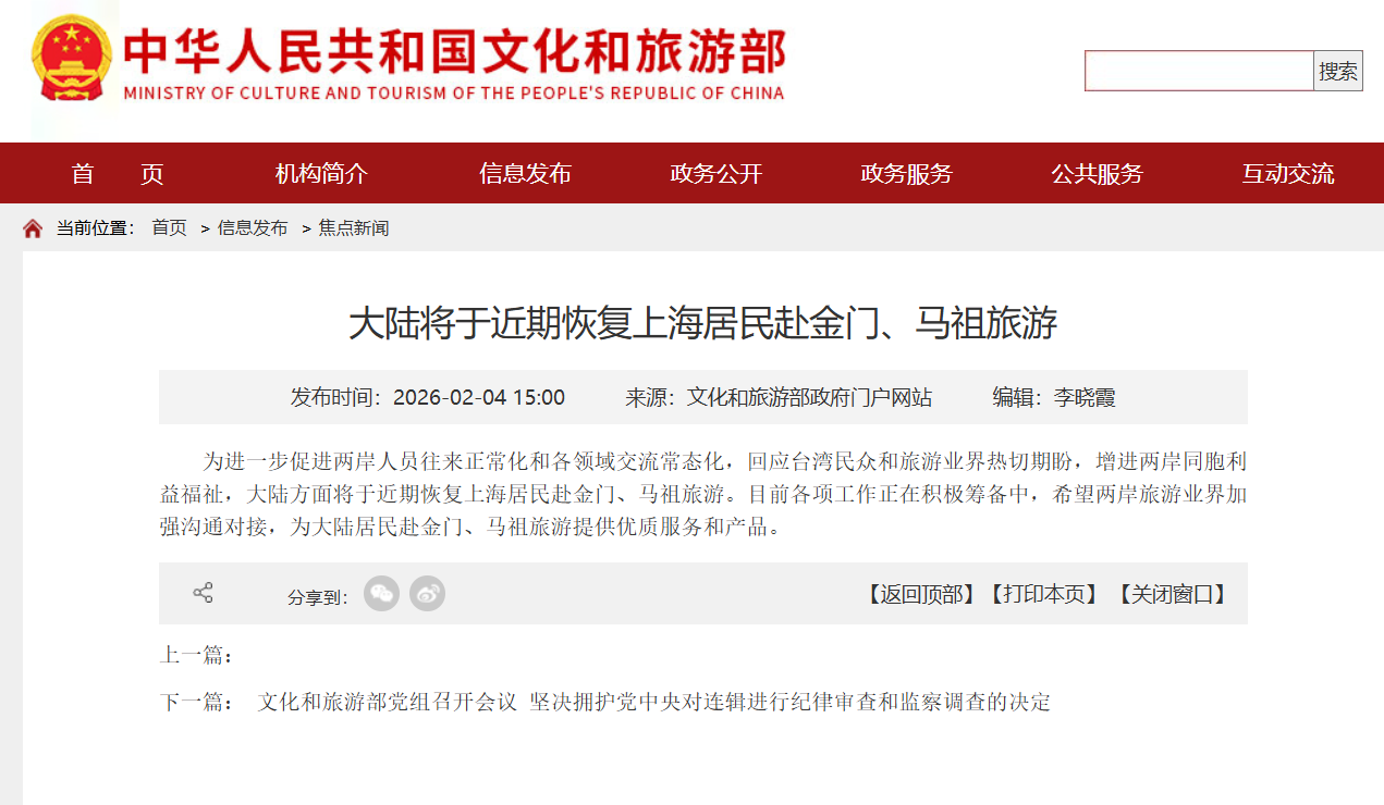 上海居民赴金门、马祖旅游将恢复,国台办回应