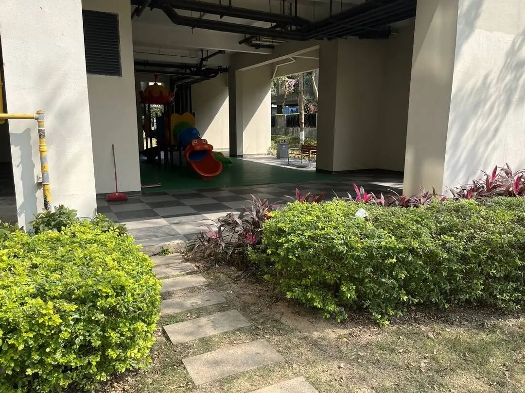 曾被投放有毒猪肉碎的小区草坪,一旁是儿童娱乐设施。受访者供图