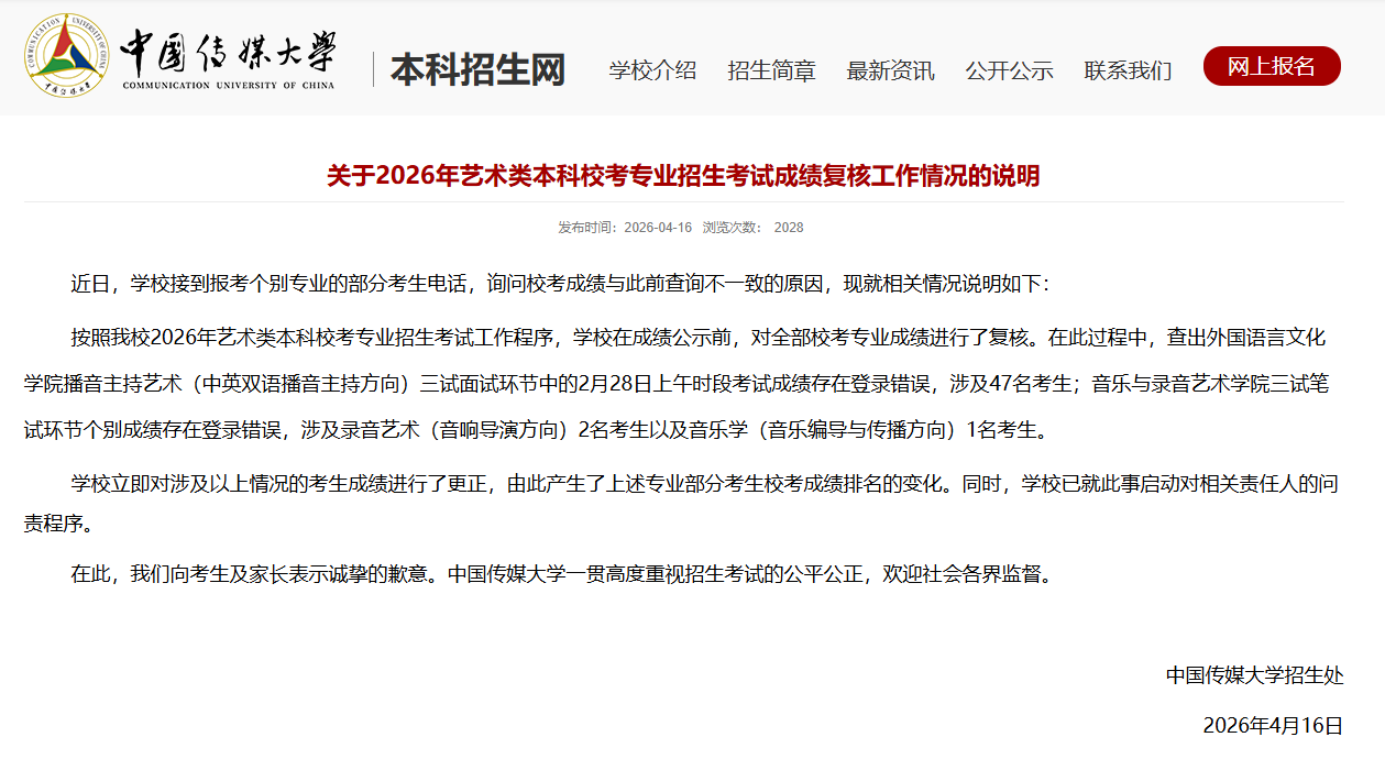 50名考生艺考成绩被登错,中国传媒大学致歉:已对考生成绩进行更正,部分考生校考成绩排名变化,学校已启动对相关责任人的问责程序