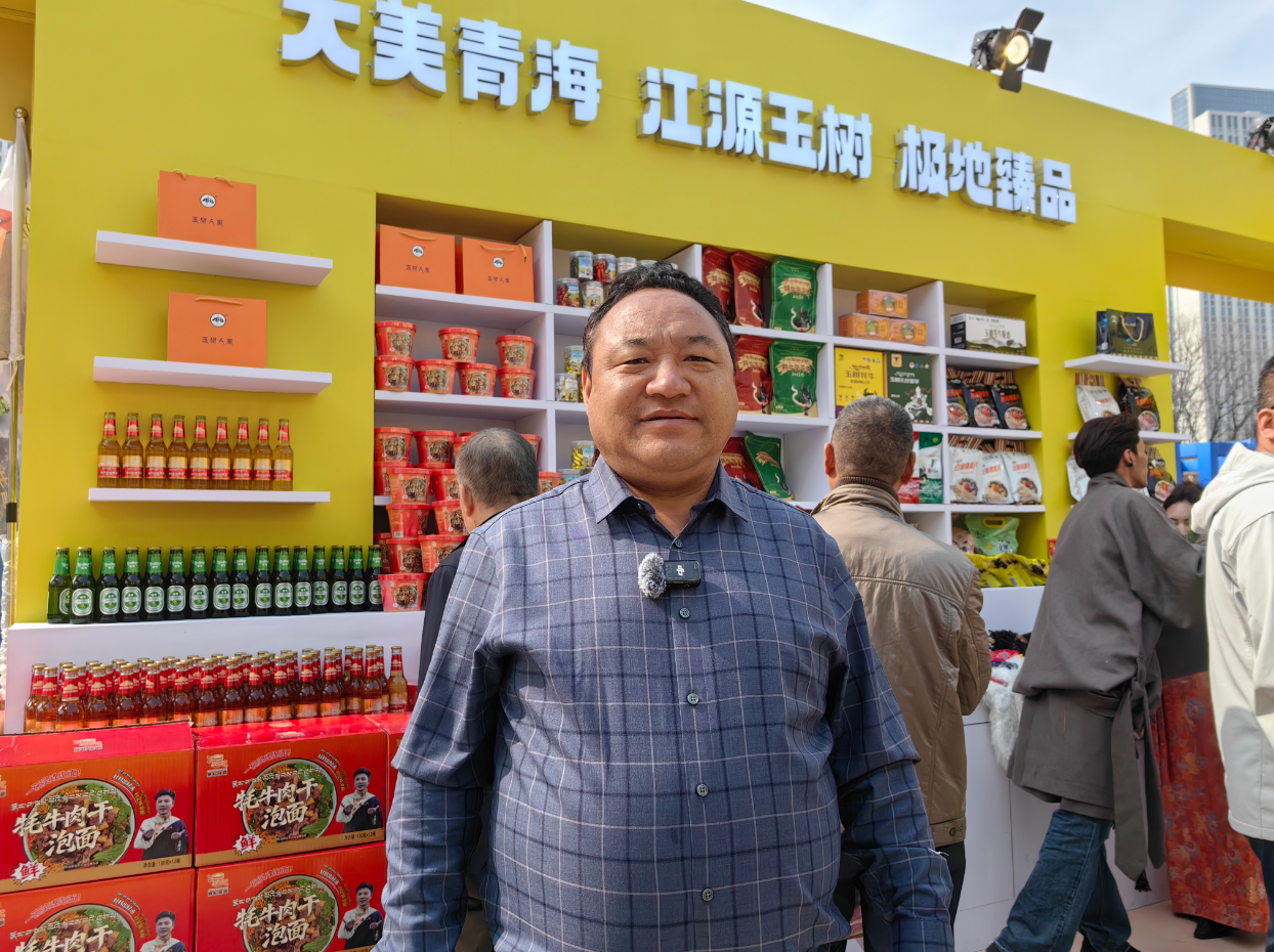 走进位于赛事现场的“大美青海 江源玉树 极地臻品”展区,100平方米的展示空间内人头攒动、气氛热烈。展区专门设置了特色农畜产品展销推介专区,玉树牦牛肉、扎什加羊肉、黑青稞制品、芫根等地理标志产品整齐陈列,极具高原特色的文旅产品吸引了众多泰安市民和各地游客驻足观看品尝。现场飘散的牦牛肉、藏羊肉香气更是让人垂涎欲滴,不少游客在品尝后连连称赞。