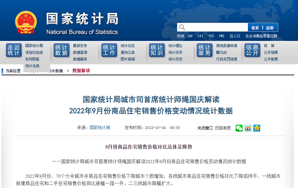 国家统计局城市司首席统计师绳国庆指出,2022年9月份,70个大中城市中商品住宅销售价格下降城市个数增加,各线城市商品住宅销售价格环比下降或持平,一线城市新建商品住宅和二手住宅销售价格同比涨幅一落一升、二三线城市降幅扩大。