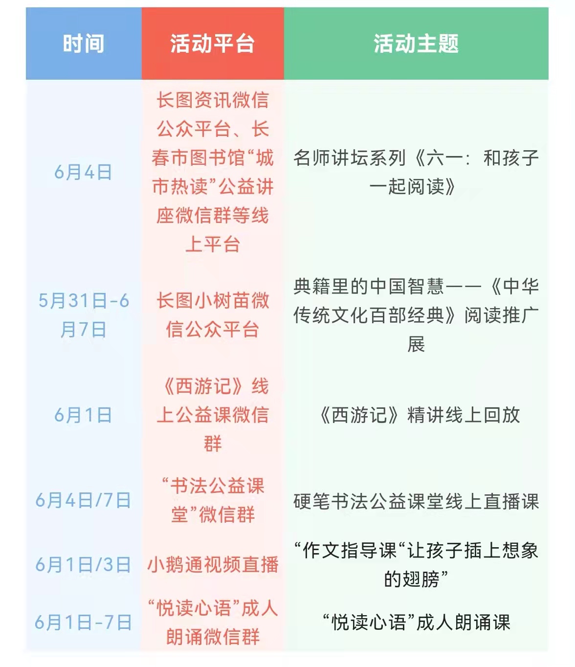 七彩韶光惊华梦,最是书香深迷人。童年有无忧无虑的游戏,有无顾无忌的欢笑,有无拘无束的玩耍,也有无二无别的书香。六月的颜色是童年的,伴着花的沃土和歌的海洋,在即将到访的六月,孩子们喜欢的季节里,属于孩子们的节日要来了!今年的六一国际儿童节”长春市图书馆、长春市图书馆关工委以“七彩童年 筑梦书香”为主题,为全市的少年儿童准备了丰富精彩的活动,6月1日至7日共举办特别策划、亲子阅读、讲座展览、公益课堂4大类15项阅读推广活动,让我们共同绘就七彩记忆,以书香为少年们筑梦即将到来的六一国际儿童节。