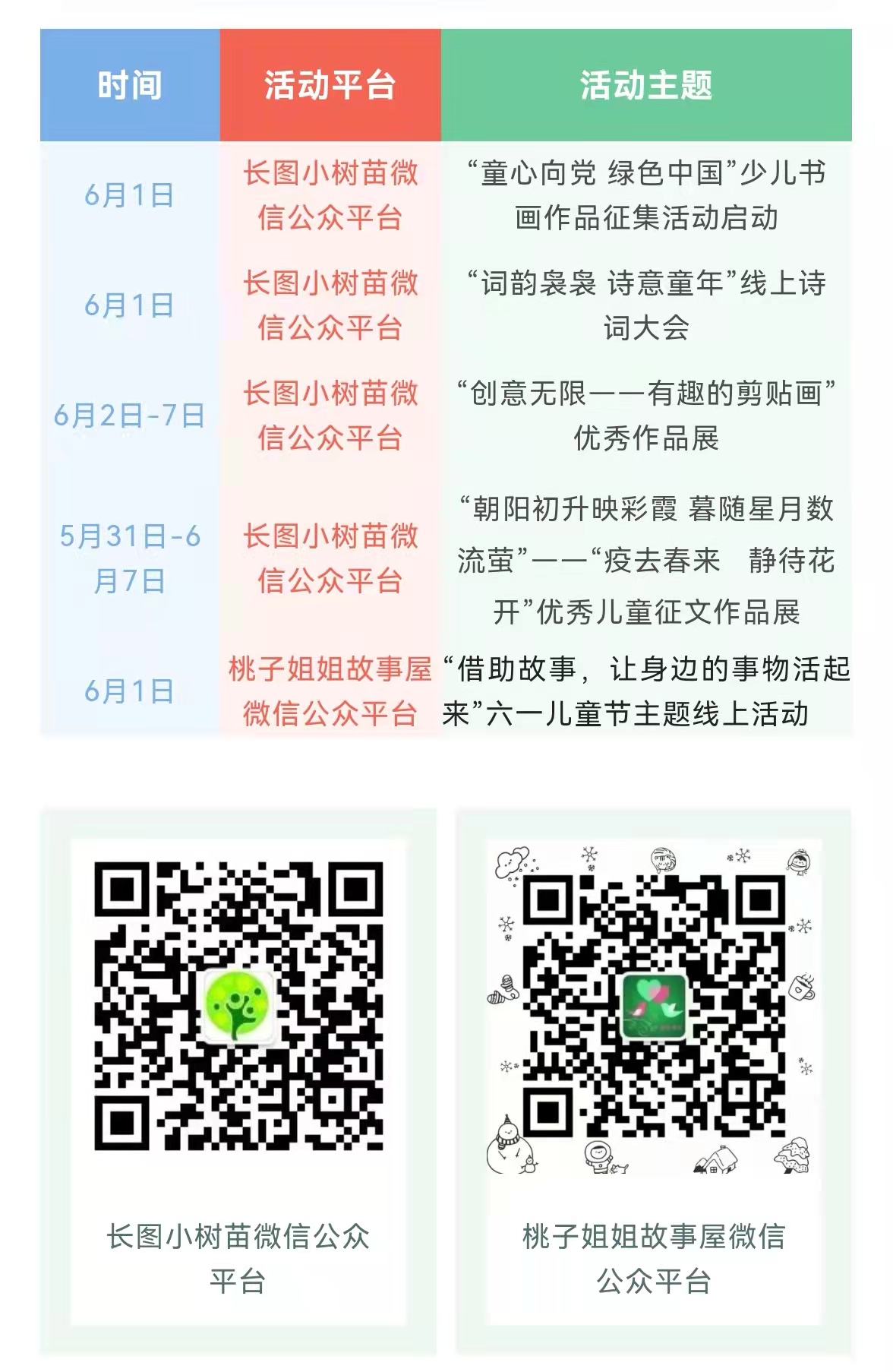 特别策划活动具有沉浸式互动性的特点。六一当天线上启动“童心向党 绿色中国”少儿书画作品征集活动,鼓励少年儿童以书画的形式表达热爱祖国大好河山的真情实感,坚定理想信念,汇聚形成广大少年儿童喜迎党的二十大的浓厚氛围;迎六一线上诗词大会已连续举办三年,今年以“词韵袅袅 诗意童年”为主题,于六一当天在长图小树苗微信公众号上再次与小朋友们相见;“创意无限——有趣的剪贴画作品征集活动”以中国原创儿童作品为创作背景,引导孩子们利用废旧物品制作创作剪贴画,激发少年儿童阅读兴趣、创造力与想象力,六一活动期间将选取优秀作品进行线上展示;“疫去春来 静待花开”有奖征文活动自3月份开展以来,共征集到稿件100余篇,作品包含深情,情真意切,触动人心,从中遴选出的少儿组优秀作品以“朝阳初升映彩霞 暮随星月数流萤”为主题,通过长春图书馆新媒体矩阵向广大读者展示;另外,桃子姐姐故事屋微信公众平台还将在六一当天举办“借助故事,让身边的事物活起来”六一儿童节主题线上活动,通过创编、扮演等形式,让孩子们感受到阅读故事带来乐趣,充分调动孩子们的想象力,激发儿童善于发现身边有趣的事物的能力。