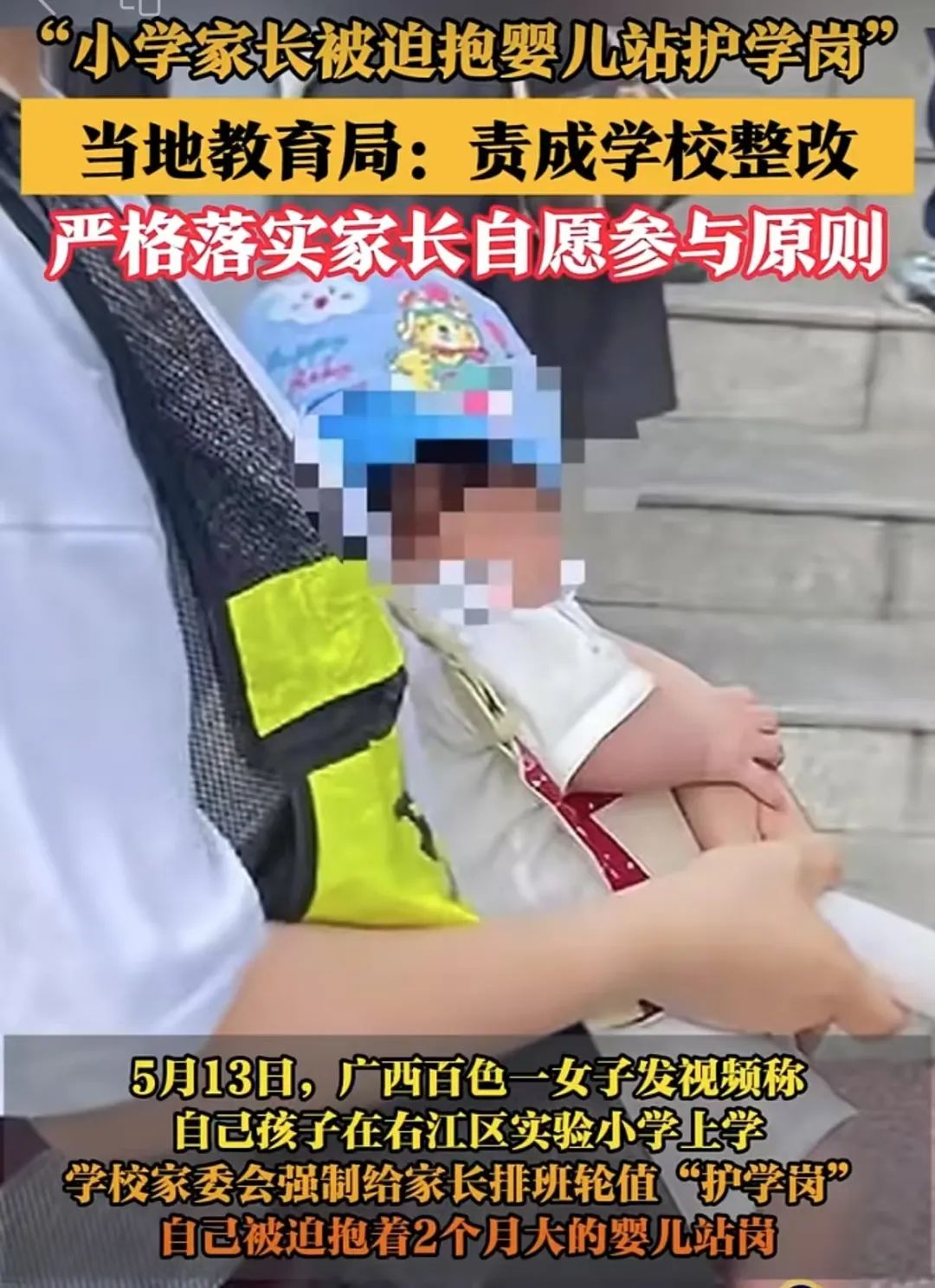 5月13日,在广西百色,女子发视频称,自己孩子在右江区实验小学上三年级,学校家委会强制给家长排班轮值护学岗,自己被迫抱着2个月大的婴儿站岗。