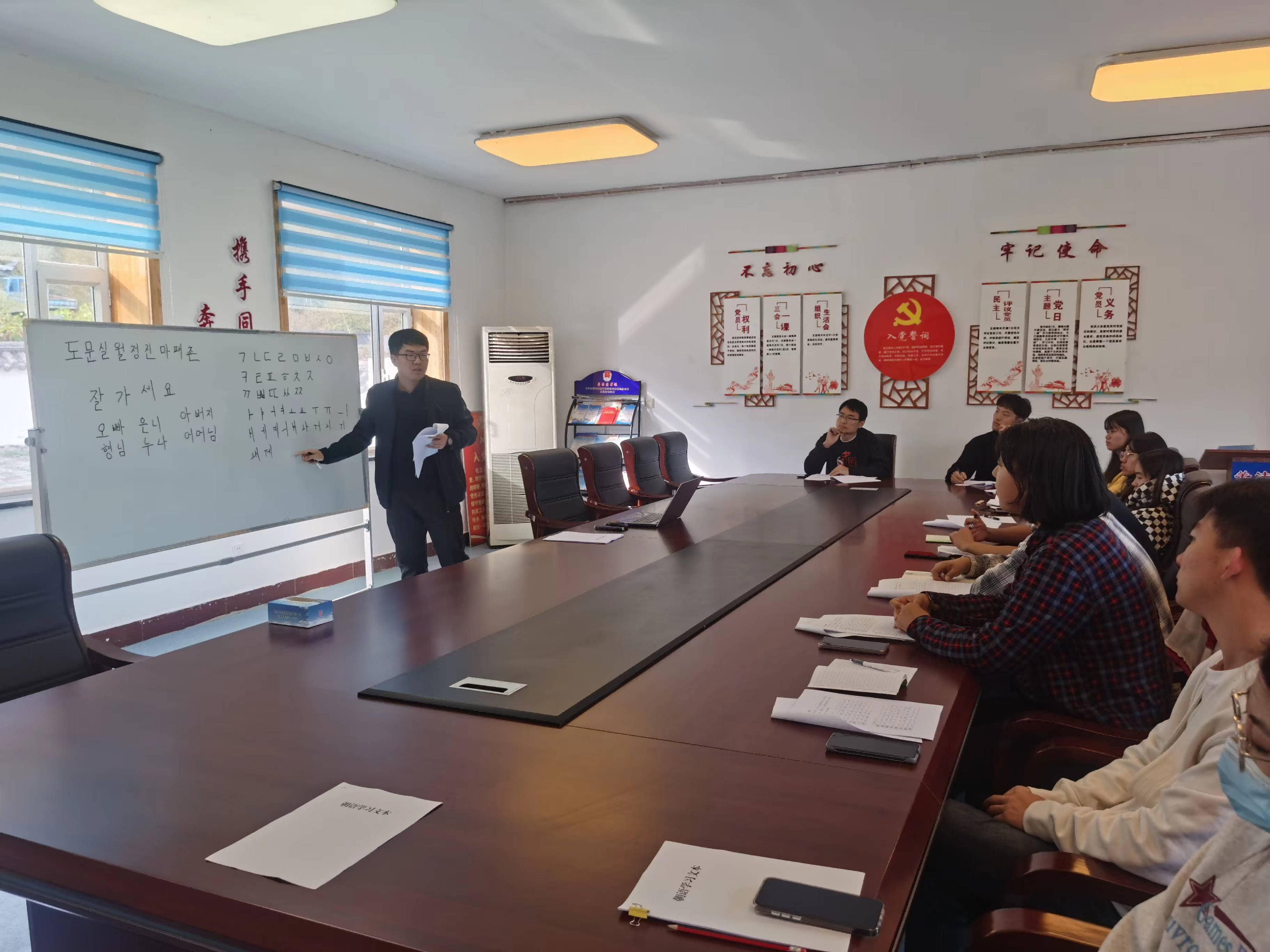 为此,马牌村驻村工作队特地组织了朝语培训班,由驻村工作队朝鲜族队员池泳涛为志愿者们量身定制了“乡村振兴朝语基础教程”,根据日常工作、交流的需要,针对乡村振兴常用语句、词汇进行培训,帮助志愿者们提升朝语交流能力,更加深入的融入到朝鲜族文化氛围中。目前,朝语培训班已经完成第一次授课,志愿者韩兆岳开心的说:“通过课程我收获很多,现在我有了自己的朝语名字,能够用朝语跟老百姓打招呼了,我非常期待未来能够用朝语直接跟村民沟通。”