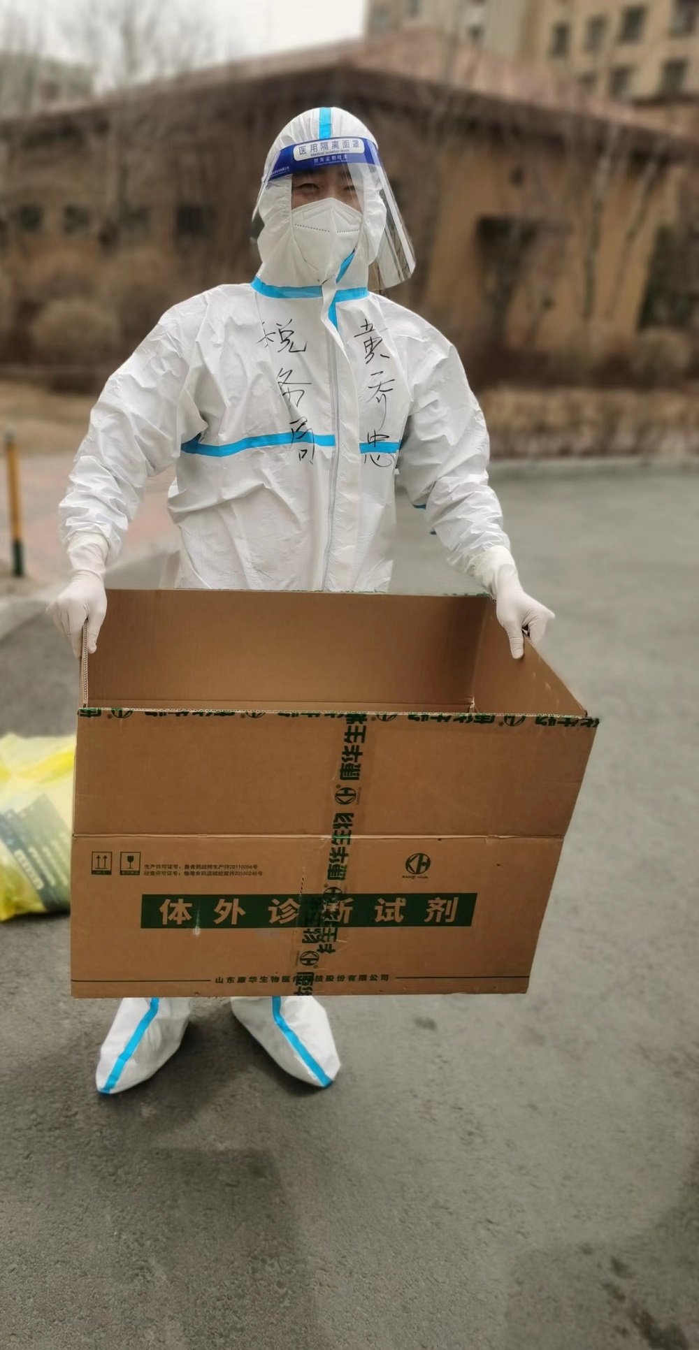 17号楼2单元单元长、中建材地勘吉林总队杨雷,面庞黝黑,不善言语,在一次面对千余箱蔬菜包的转运任务只能用小车推的现状,不打喯的说:我年轻,哥哥们靠后,我先上。毅然推上小车,往返各楼栋之间,直至最后。