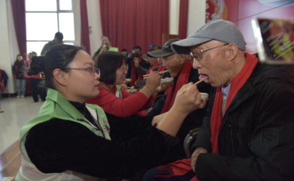 当地李家屯老人邵凤娟看到志愿者端上来香喷喷的饺子说:“活了这么大岁数还是第一次参加饺子宴,我太高兴了!”