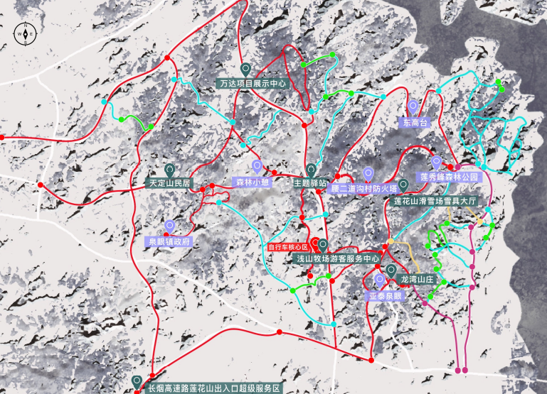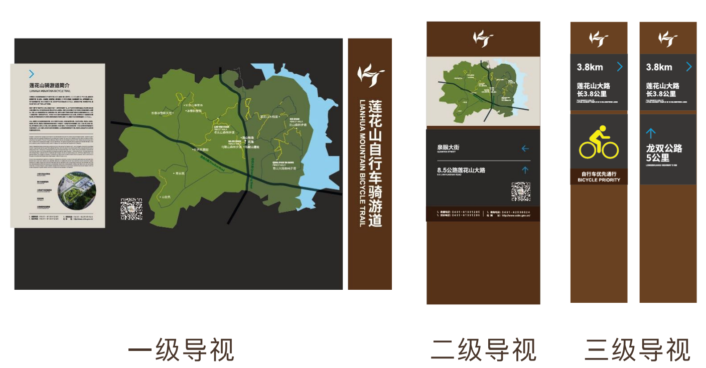 在主要路段交叉路口处,都将按照行进方向,配合交通信号灯的指引,设置相关标识导向,骑友可以结合空间标识,徜徉于莲花山百公里骑游网线中。