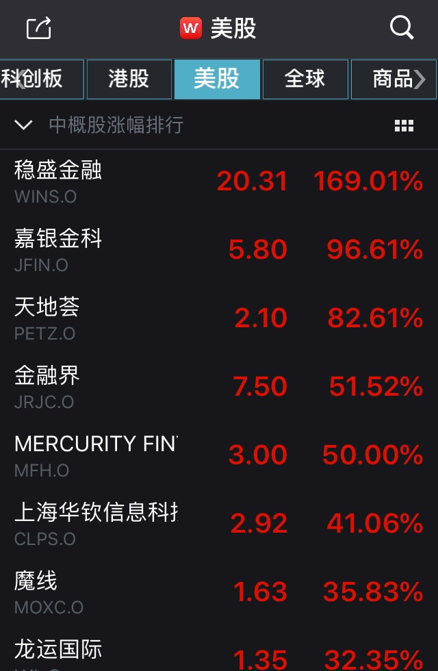 截至收盘,稳盛金融仍涨169%,嘉银金科涨96.6%,金融界涨51.5%,而房多多跌逾66%。据腾讯财经统计,稳胜金融54次触发熔断,房多多23次触发熔断,嘉银金科8次触发熔断,金融界10次触发熔断,普益财富6次触发熔断,多只中概股盘中共触发了101次熔断。