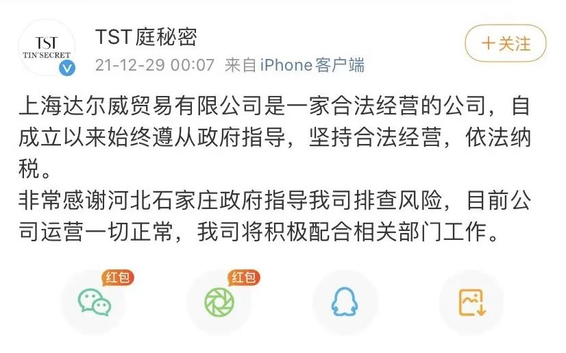 对此,TST庭秘密29日凌晨在官方微博回应称,上海达尔威是一家合法经营的公司,自成立以来始终遵从政府指导,坚持合法经营,依法纳税。非常感谢河北石家庄政府指导公司排查风险,目前公司运营一切正常,公司将积极配合相关部门工作。