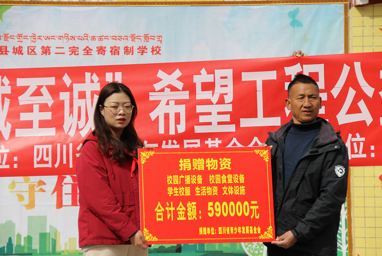 发放仪式上,共青团白玉县委向县二完小发放了学生校服1286套、校园广播设备1整套、校园食堂设备2台、办公电脑6台、打印机17台、复印机1台、学校专用大型全自动洗衣机4台、生活物资(A3纸20件、洗衣粉50袋、洗洁精30瓶)、文体设施312套,合计金额59万元。据悉,此次活动所有捐赠物资由四川省青少年发展基金会提供。
