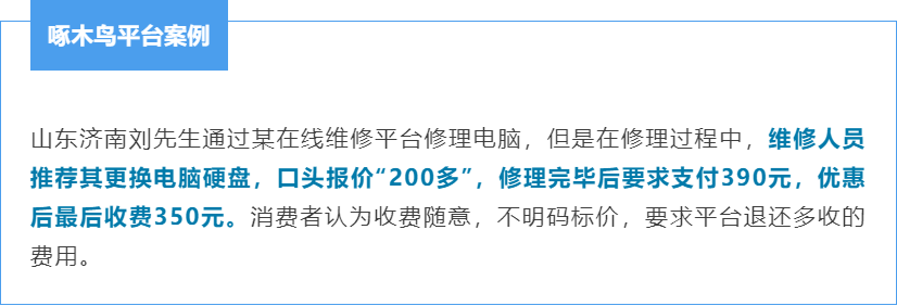 近期,有消费者向啄木鸟消费者投诉平台投诉,在通过某在线维修平台修理家电时,遇到过收费随意、不明码标价等情况。