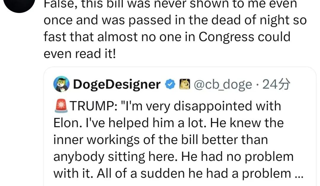 在特朗普发表对马斯克的评价后,马斯克迅速在社交媒体上回应并反驳称,“大错特错,这项法案一次也没有给我看过,而且是在深夜迅速通过的!”