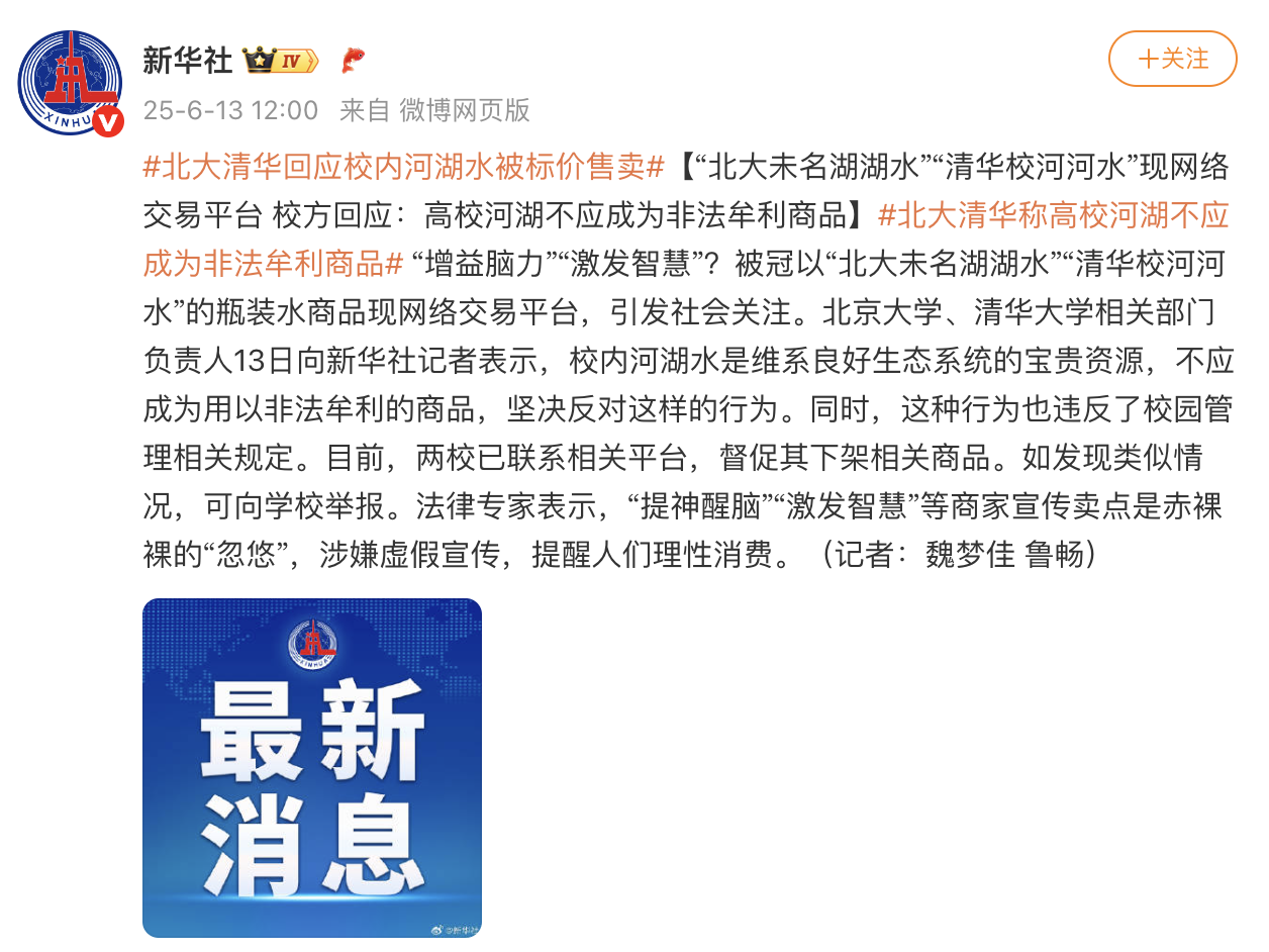 99元可买“北大未名湖水”“清华河水”……北大清华回应:可举报