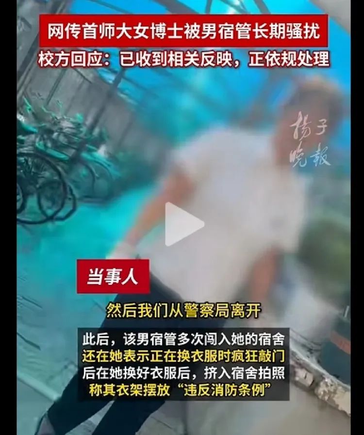 近日,北京首都师范大学一名女博士在社交平台发帖,称其长期遭宿舍男宿管骚扰,涉及肢体接触、言语威胁等行为,后虽经协调更换宿舍,但她表示仍未摆脱困扰。此事件在社交平台引发广泛关注。