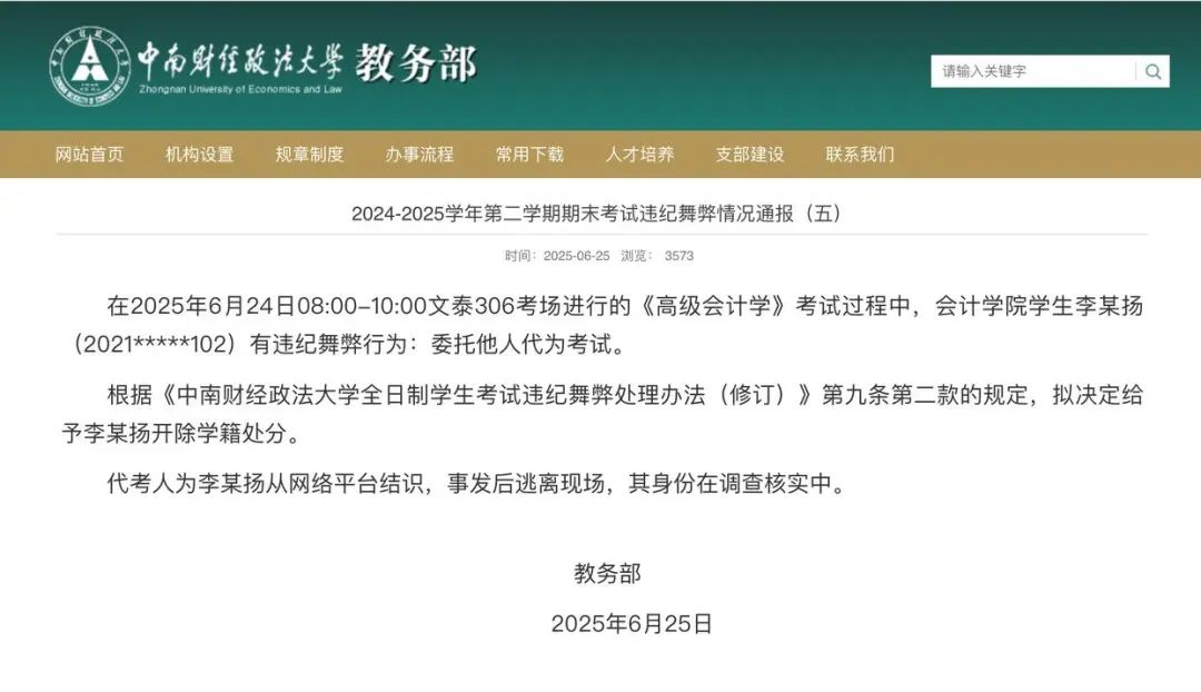 “武汉一大学有男子穿女装替考”,官方通报:李某扬有违纪舞弊行为,委托他人代为考试,拟开除学籍