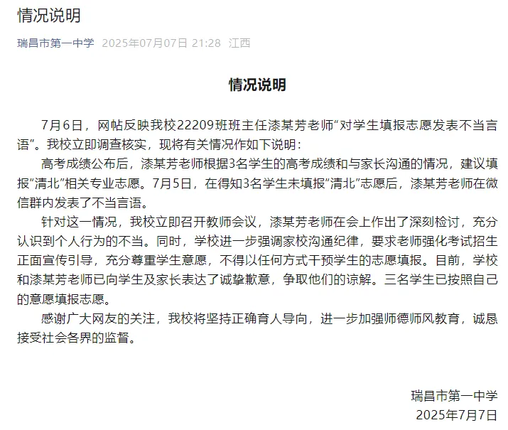 针对这一情况,瑞昌一中立即召开教师会议,漆某芳老师在会上作出了深刻检讨,充分认识到个人行为的不当。同时,学校进一步强调家校沟通纪律,要求老师强化考试招生正面宣传引导,充分尊重学生意愿,不得以任何方式干预学生的志愿填报。目前,学校和漆某芳老师已向学生及家长表达了诚挚歉意,争取他们的谅解。三名学生已按照自己的意愿填报志愿。