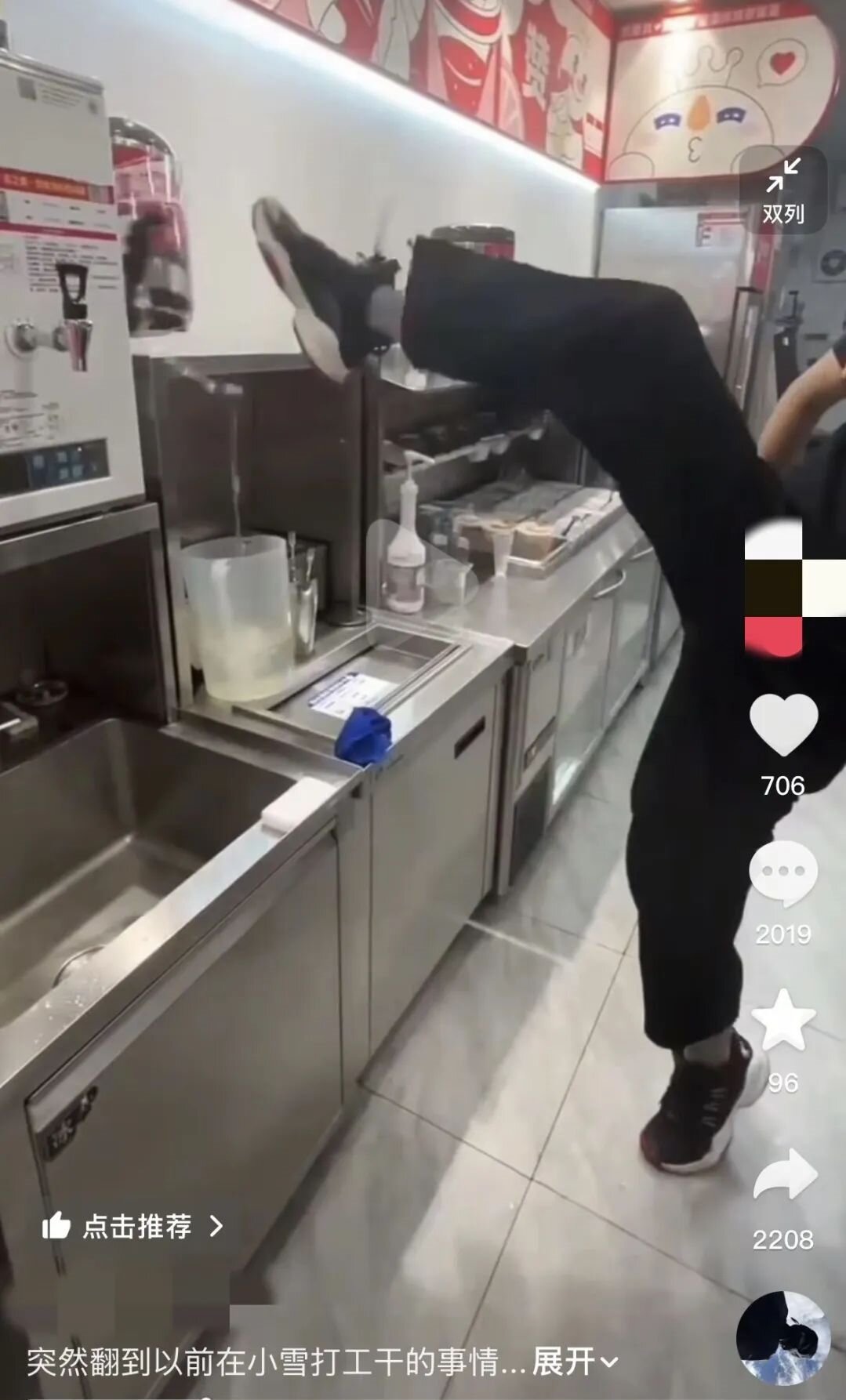 这名网友晒出的视频显示,一名男子用脚踢向操作台上直饮水桶的水龙头,尝试进行关闭。直饮水桶的下方是一个盛有液体的量桶。男子所处的房间以及直饮水桶上均贴有蜜雪冰城的LOGO。视频的配文是:突然翻到以前在小雪打工干的事情,笑死我了。目前,上述视频已经删除,该网友也将账号内的视频全部清空。