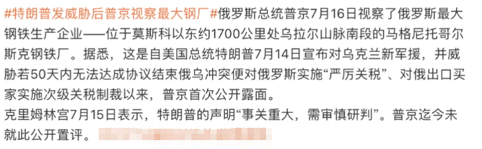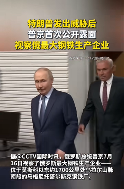 俄罗斯总统普京7月16日视察了俄罗斯最大钢铁生产企业——位于莫斯科以东约1700公里处乌拉尔山脉南段的马格尼托哥尔斯克钢铁厂。据悉,这是自美国总统特朗普7月14日宣布对乌克兰新军援,并威胁若50天内无法达成协议结束俄乌冲突便对俄罗斯实施“严厉关税”、对俄出口买家实施次级关税制裁以来,普京首次公开露面。