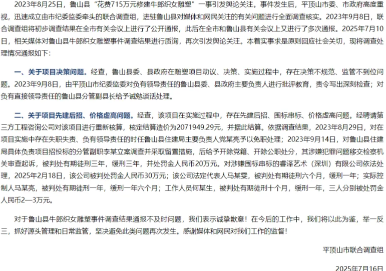 “鲁山县花715万建牛郎织女雕塑”,官方通报!