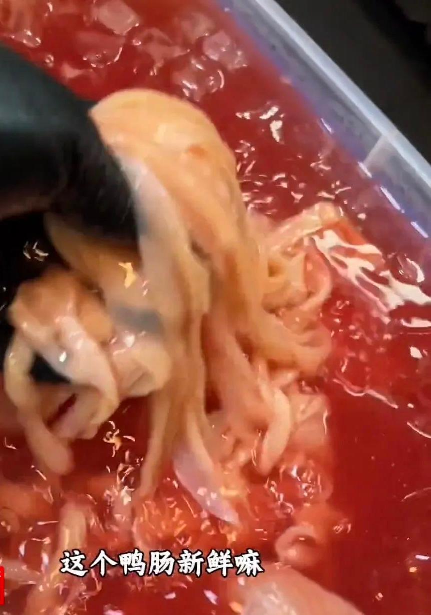 此前,7月17日,一博主发视频演示在一饭店后厨用血浆、鸭肠粉将冻鸭肠调制成看起来新鲜的“鲜鸭肠”,视频引发广泛关注及大量网友质疑。
