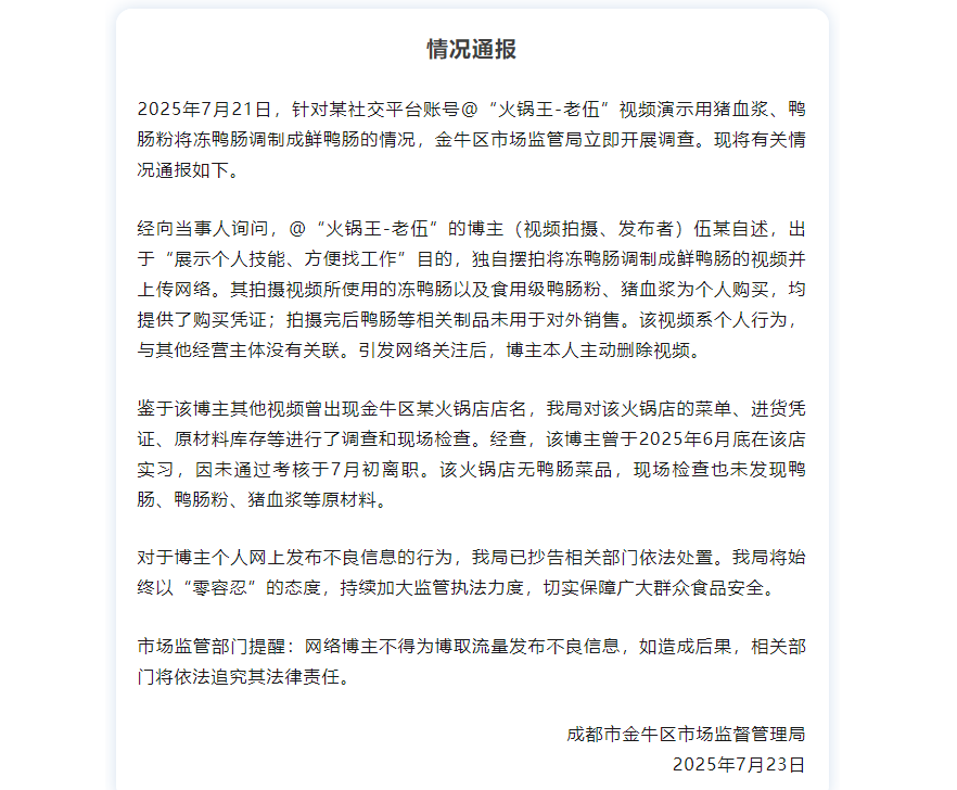 7月21日,针对某社交平台账号“火锅王-老伍”视频演示用猪血浆、鸭肠粉将冻鸭肠调制成鲜鸭肠的情况,金牛区市场监管局立即开展调查。现将有关情况通报如下。
