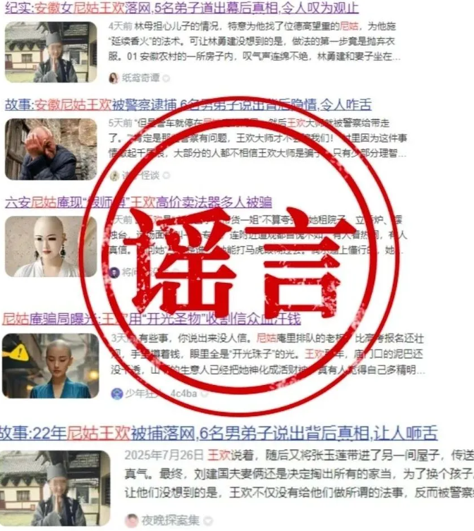 “霍山警方”微信公号消息,近日,网传“安徽尼姑王欢被逮捕,6名男弟子揭露真相”等贴文引发网民广泛关注。经查:该贴文系部分网络博主通过篡改数年前我县公安机关查获的“假尼姑兜售假佛珠”旧闻进行编造,以达到吸引流量的目的。