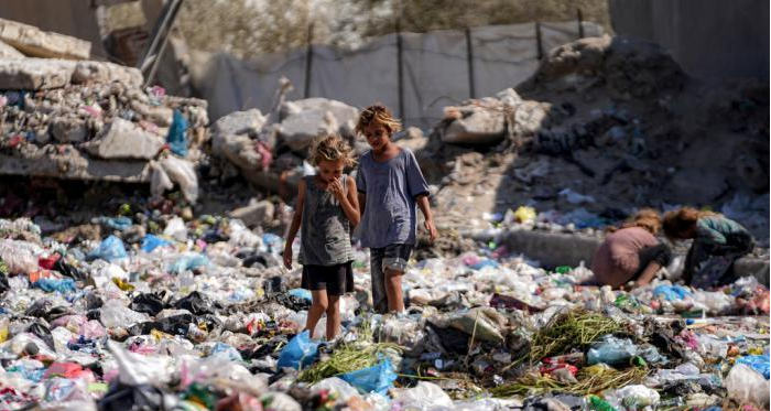当地时间2024年8月29日,在加沙地带中部,孩子们走在垃圾堆上。