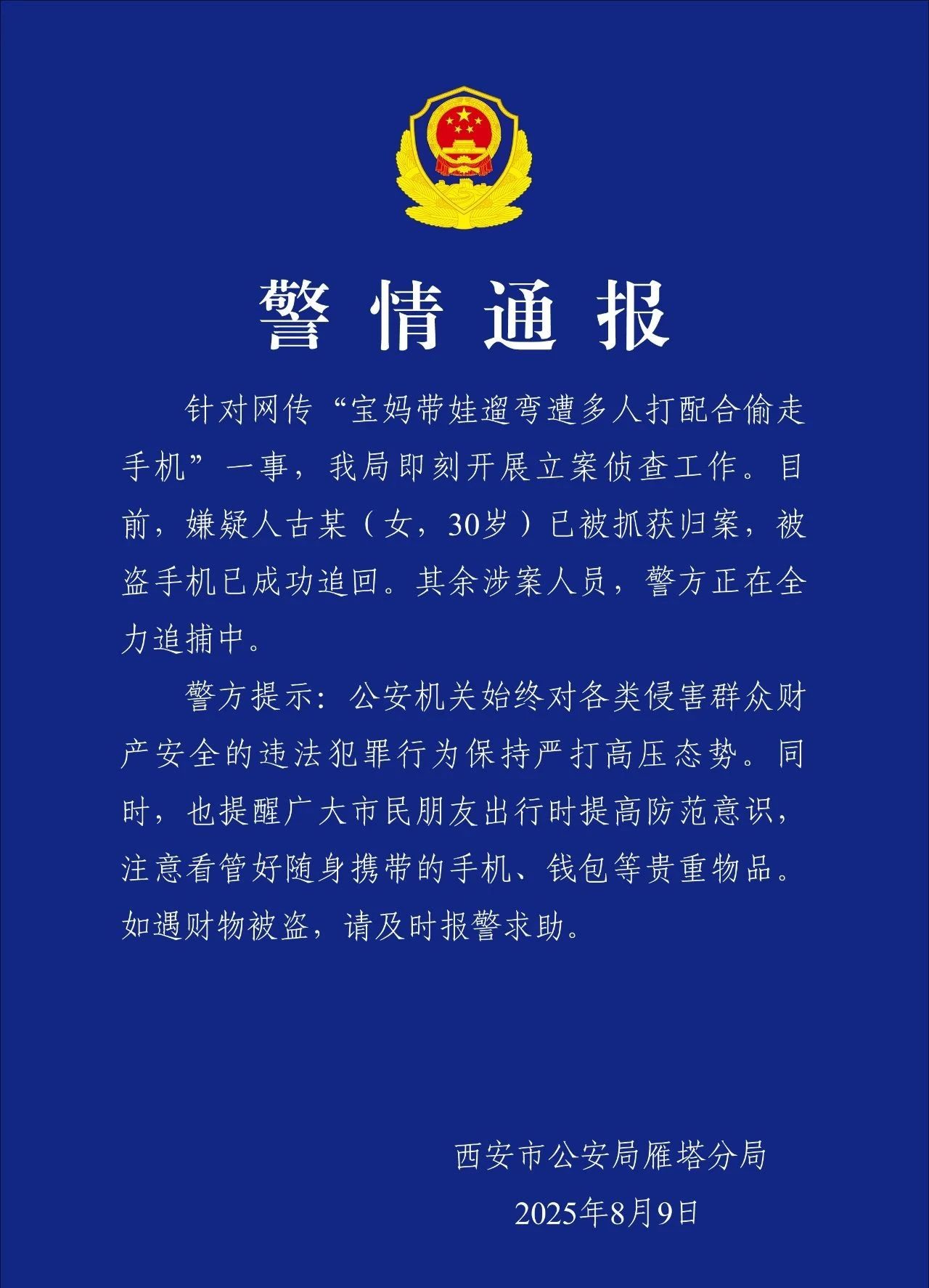 上周六(8月9日),陕西西安市公安局雁塔分局发布警情通报称:嫌疑人古某(女,30岁)已被抓获归案,被盗手机已成功追回。其余涉案人员,警方正在全力追捕中。
