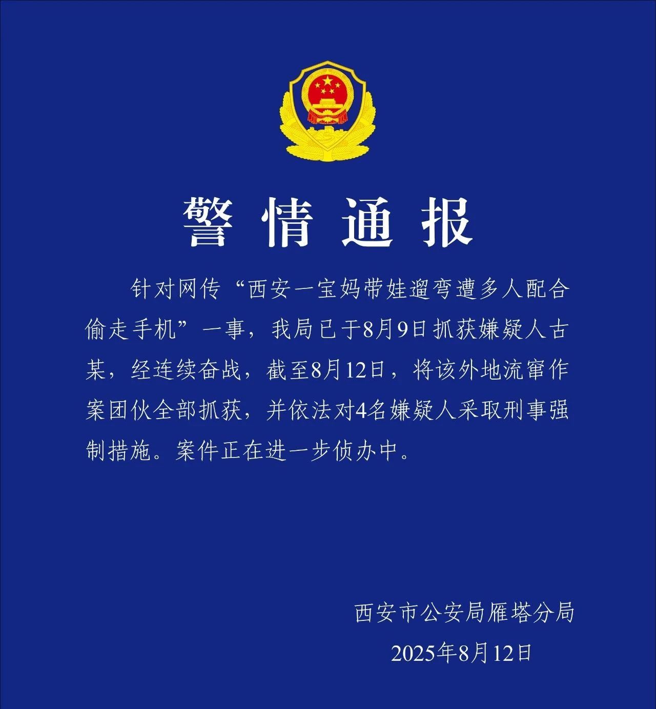 针对网传“西安一宝妈带娃遛弯遭多人配合偷走手机”一事,该局已于8月9日抓获嫌疑人古某。经连续奋战,截至8月12日,将该外地流窜作案团伙全部抓获,并依法对4名嫌疑人采取刑事强制措施。案件正在进一步侦办中。
