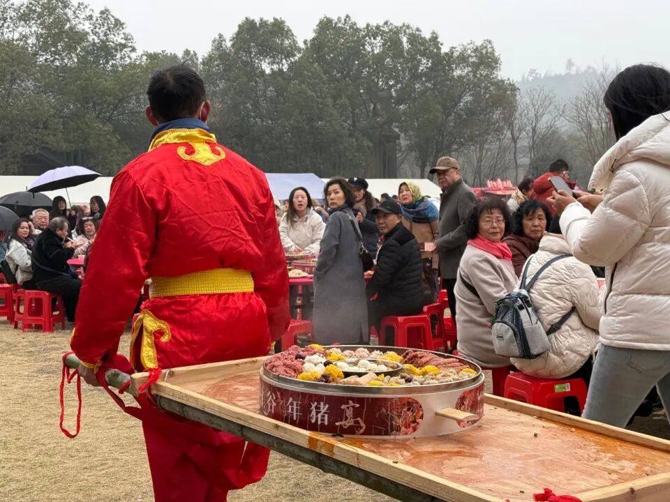 12月20日,武汉黄陂野村谷景区上演了一场“沸腾”的年猪宴,150余桌宴席、1500余人同时开席,抬着整头黑猪绕场、近二十道菜陆续登场,这场定期举办的盛宴,每人收费40元,不仅让游客直呼“找到了年味”,更让本地村民日赚2000元。