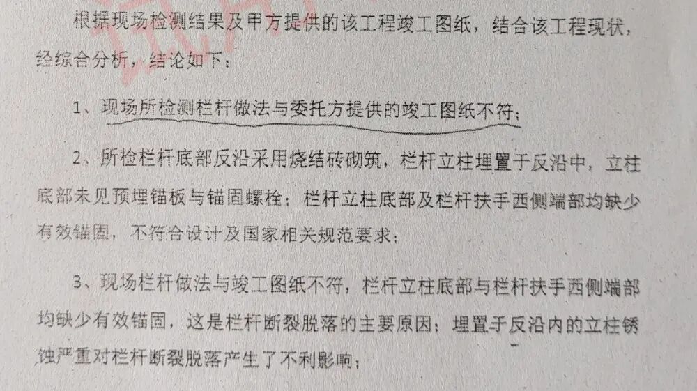 熊杰提供给记者的一份鉴定报告显示,断裂的栏杆并未按照竣工图纸施工,不符合国家相关规范要求。他认为,施工、监理、校方等单位的主要责任人员都应对此担责。