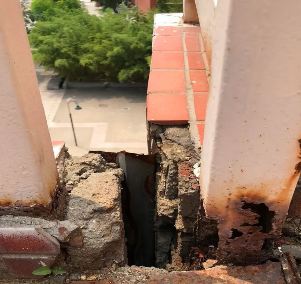 ▲2018年7月,事发教学楼锈蚀的栏杆。受访者供图