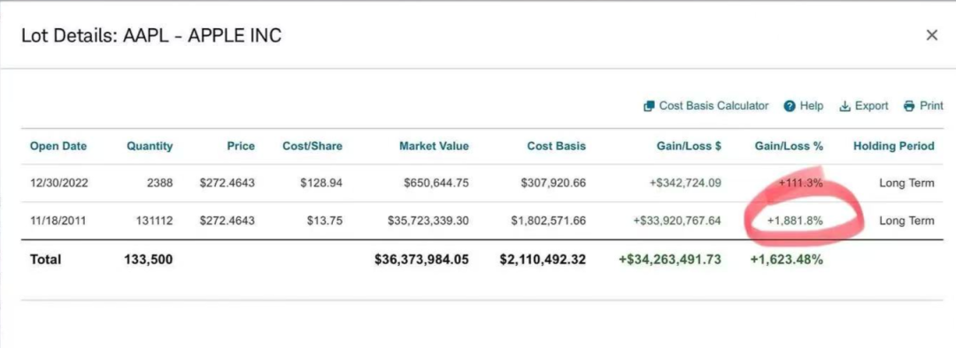 而更早一笔购入是在2011年11月,当年正是苹果进入“库克时代”的转折年。2011年8月乔布斯辞去苹果CEO,一个多月后去世,市场对苹果未来充满不确定性,股价不断下跌,最低点跌至12.6美元/股(后复权)。有网友对此评价称,“在市场对库克能否带领苹果再上台阶充满怀疑的11月买入苹果股票,也是需要很大的勇气。”